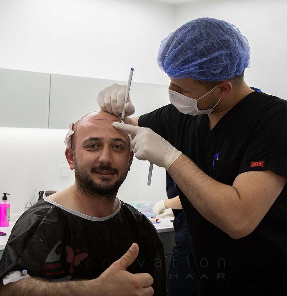 Der wichtigste Aspekt vor Beginn der Haartransplantation ist die präzise Festlegung der sogenannten „vorderen Haarlinie“ – einschließlich ihrer natürlichen Vertiefungen und Erhebungen sowie der allmählichen Zunahme der Haardichte von gering zu hoch.Um das natürlichste Haarbild zu erzielen, sollte die vordere Haarlinie unter Berücksichtigung des Alters der Person von einem Fachmann mit einem Stift exakt bestimmt werden.